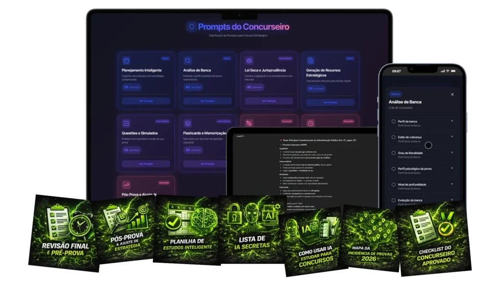 Você recebe acesso a um material digital com 400 prompts estratégicos de IA para concursos, organizados por etapas do estudo (planejamento, resumos, questões, revisão, banca, memorização, reta final e estratégia de prova), além dos bônus inclusos na oferta.