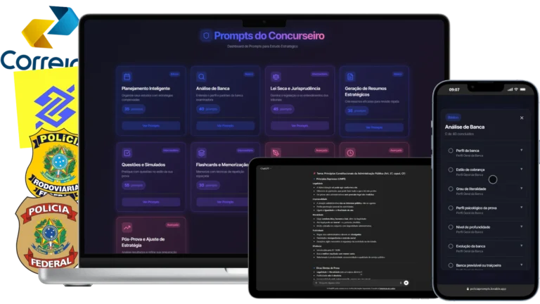 Sim. Os prompts ajudam você a adaptar seus estudos ao estilo de qualquer banca brasileira (FGV, CEBRASPE, FCC, VUNESP, IBFC e outras).