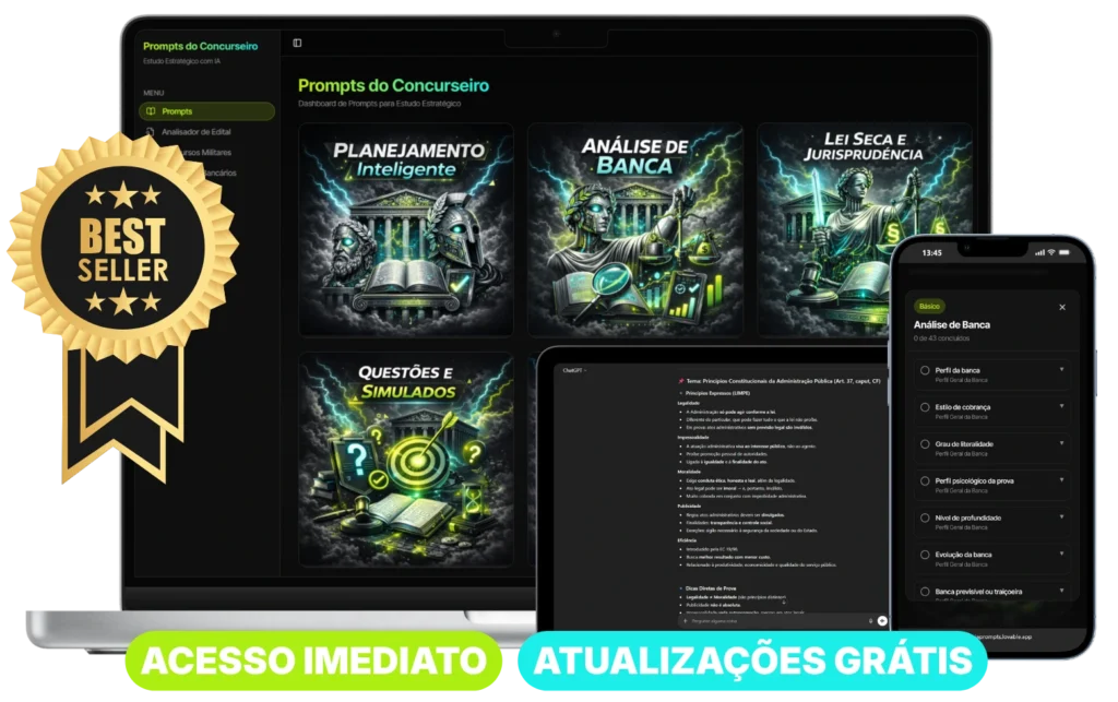 Você recebe acesso a um material digital com 400 prompts estratégicos de IA para concursos, organizados por etapas do estudo (planejamento, resumos, questões, revisão, banca, memorização, reta final e estratégia de prova), além dos bônus inclusos na oferta.